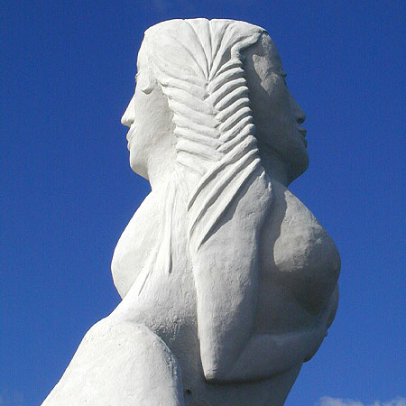 雕塑是一個(gè)雙面的雅努斯的輪廓,兩張臉同時(shí)象征著開始與結(jié)束,過去和未來,出發(fā)和回歸。從海上歸來的旅行者看到的是樂觀和外向一面,而面對(duì)港灣的是內(nèi)向和沉思的一面。